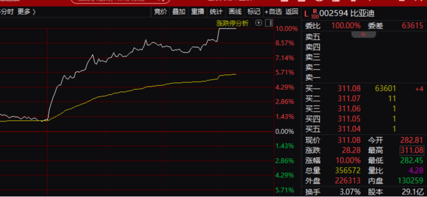 尾盘,比亚迪突然涨停,并对市场形成较大带动。A股相关指数因此再度走强。